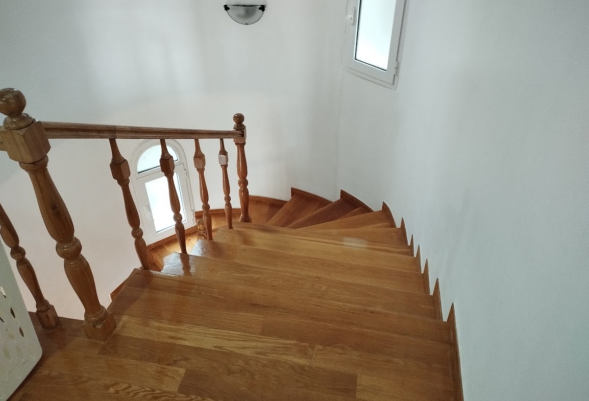 Im Erdgeschoss befindet sich ein großes und helles Wohnzimmer mit Kamin, das offen mit der Küche verbunden ist und eine warme sowie einladende Atmosphäre schafft. Auf derselben Ebene gibt es außerdem ein Gäste-WC sowie Balkone mit viel Tageslicht und Zugang zum Außenbereich.